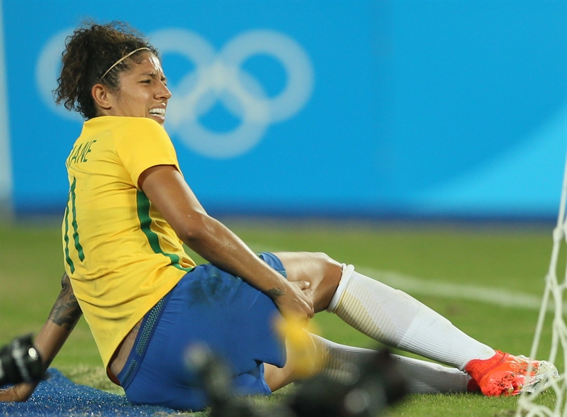 2016 Rio Olympics - Soccer - Cristiane (BRA) of Brazil reacts after an injury. REUTERS/Gonzalo Fuentes