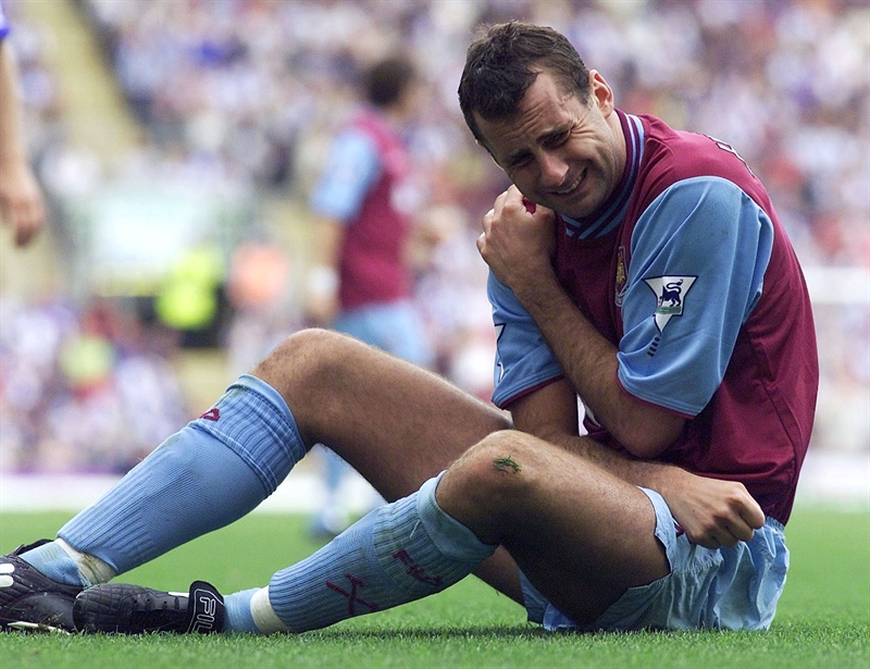 Don Hutchison holds his shoulder in pain 2001. REUTERS/Ian Hodgson