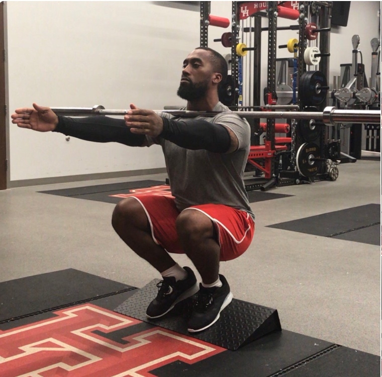 University of Houston men’s basketball Director of Sports Performance, Alan Bishop @CoachAlanBishop, extols the benefits of the cyclist squat as modeled by fellow strength and conditioning coach Jason Wooding @Coach_Wooding.