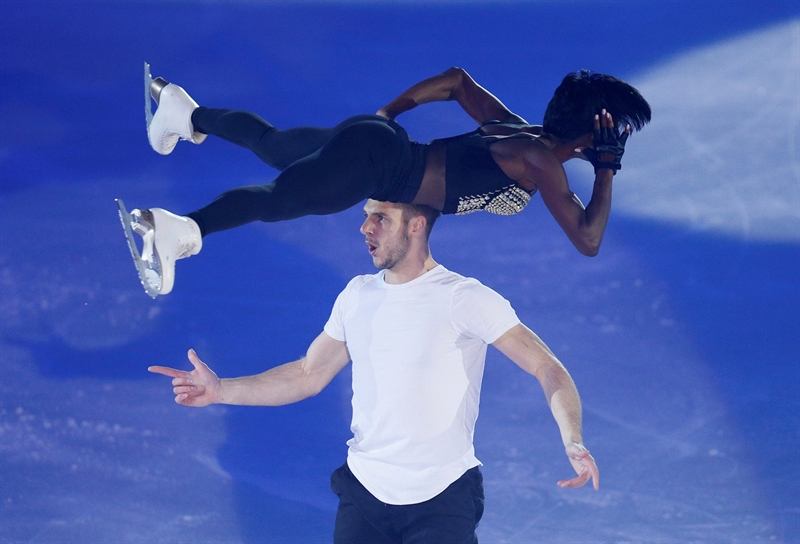 Figure Skating - ISU Grand Prix of Figure Skating - 2018 France's Vanessa James and Morgan Cipres perform during the Exhibition Gala (REUTERS/Emmanuel Foudrot). This show-stopping spin with the female skater balanced on the head of her male partner is an example of the maneuvers that may result in upper extremity, neck, and back injuries in pairs skaters.