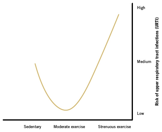 (4). Moderate activity results in a low risk of URTI compared to sedentary or strenuous exercise, which both increase the risk (