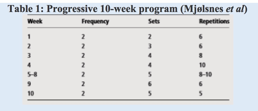 (18). This program is used over a 10-week period, and is planned to be performed twice per week. For example, in week 1 the athlete uses 2 x 6 reps twice per week, and in week 10 it is 5 sets of 5 reps. This program would most practically be performed at the end of a training session to minimise fatigue in the hamstring prior to any running based training. It has been found that strength training has a time-dependant effect on eccentric hamstring strength and that strength training after training decreases the negative influence of fatigue