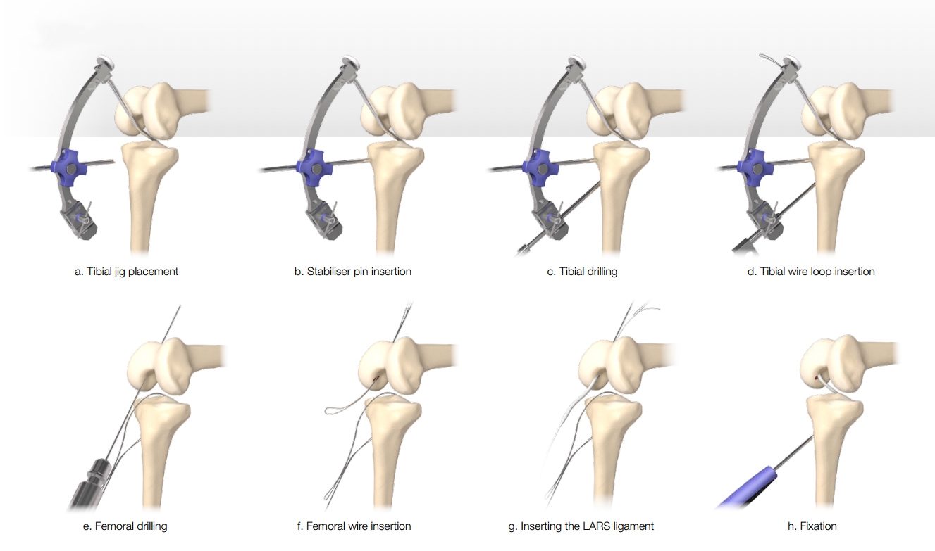 Overall, the LARS surgical technique aims to maximise in-growth of the original ACL tissue, thus preserving some vascular and proprioceptive nerve supply. The biggest advantages of this procedure are immediate graft stability, reduced rehabilitation time and quicker return to pre-injury function. Over time, the existing ACL stump regrows into the matrix and eventually replaces the LARS. Therefore, it is not used a stand- alone graft. It has been proposed that the benefit of the LARS procedure is that it allows early post-operative loading because the scaffold protects the ACL stump during its revascularisation phase, with less chance of post-operative breakdown(6).