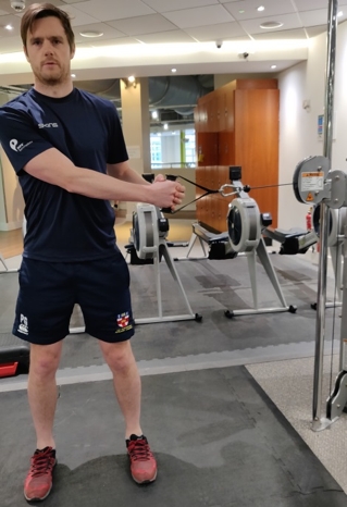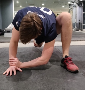 This is another anti-flexion trunk exercise with upper body activation, providing additional mobility for scapular, thoracic/ lumbar spine and posterior chain as well as posterior neural mobilisation. Perform continuously for 2 minutes.