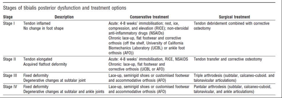 (3). However, stage three is related to irreversible subtalar joint degeneration with irreversible tendon changes. Stage four was added to include degenerative changes within the ankle joint as well as the structures involved in stage three. It is important to develop the strength of the tendon in a functional capacity once the swelling has eased and a heel raise can be performed. A simple exercise with a tennis ball between the heels (