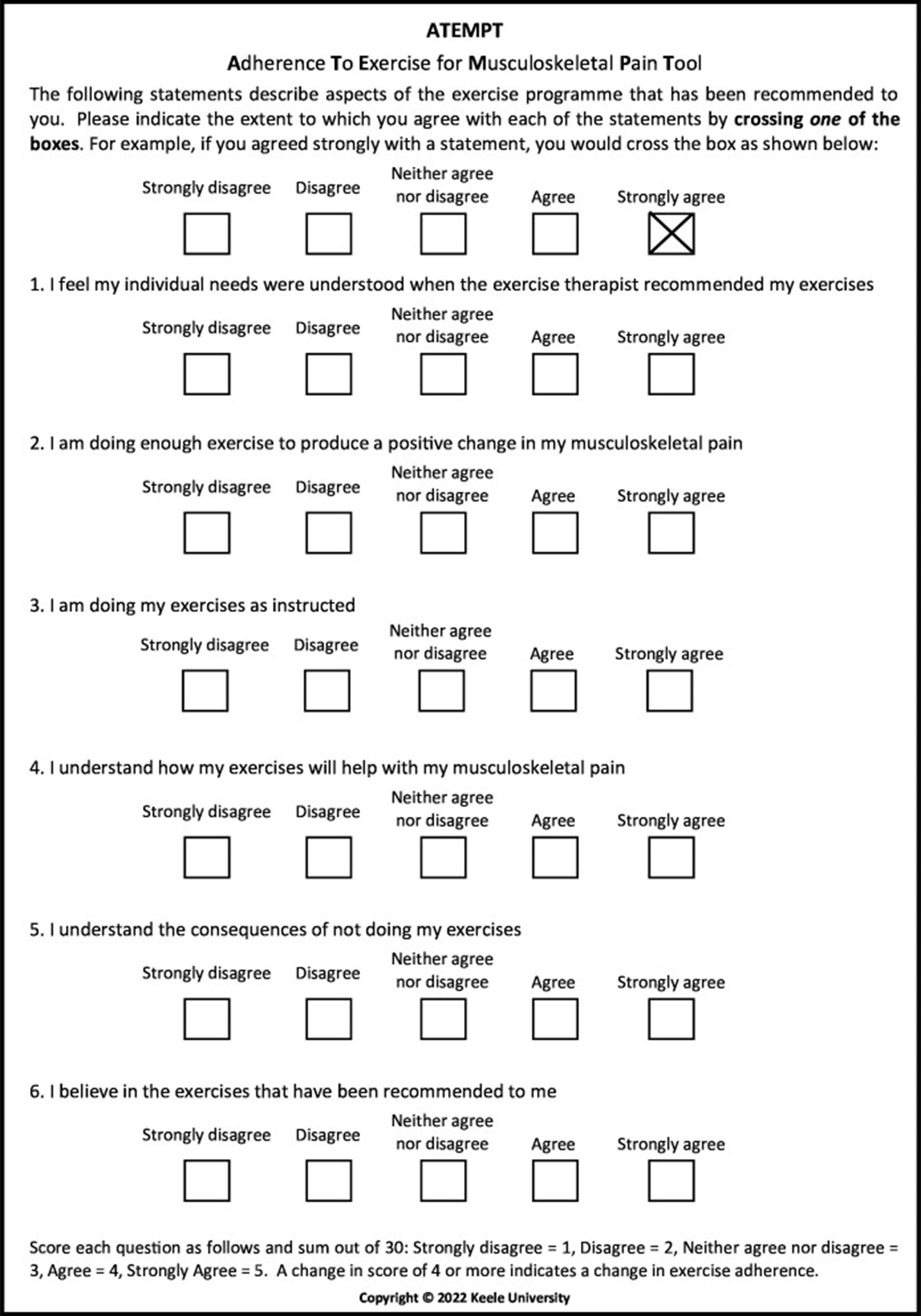 One of the foremost challenges for any rehabilitation professional is adherence to the prescribed training plan. There is often a discrepancy between prescription and what the injured athlete actually does. Researchers from Keele University in the UK aimed to address this problem by designing the Adherence to Exercise for Musculoskeletal Pain Tool (ATEMPT)(3).