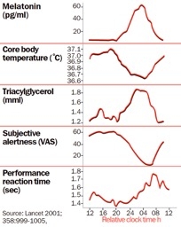 The circadian rhythm is the most powerful rhythm affecting humans; as well as the sleep/waking cycle, it affects hormone secretions, body temperature, mental alertness and physical performance capacity. The graphs below in figure 1 show the typical daily variations of the hormone melatonin, core temperature, levels of triacylglycerol, alertness and reaction time as a result of the circadian rhythm(1).
