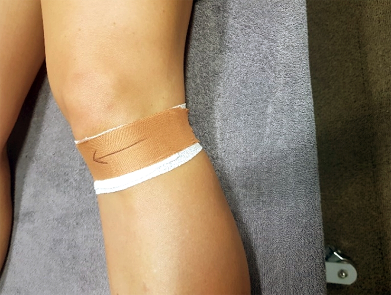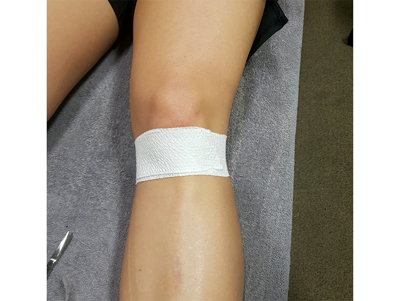 Use a tearable or non-tearable EAB type tape. Start around the posterior aspect of the fibula head and wrap anteriorly around the patellar tendon. Continues posteriorly to completely encircle the knee (this is placed on lightly so as to not occlude blood flow) (see figure 2).