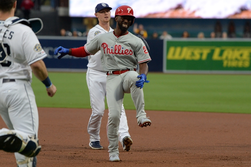 2019; Philadelphia Phillies center fielder Andrew Mccutcheon (right) grabs at his knee after being tagged out. Photo Credit: Jake Roth-USA TODAY Sports