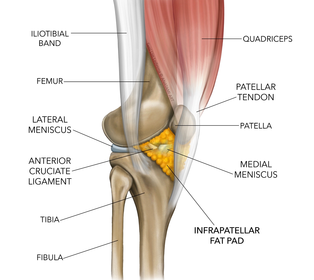 When the posterior layer of the IFP adheres to the synovial lining of the knee joint, repetitive stretching and irritation can lead to synovitis and cause anterior knee pain(17).