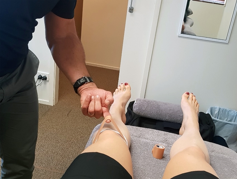 The purpose of taping the IFP is to draw the inferior pole of the patella away from the symptomatic IFP. Shown below is a taping procedure that is suitable for athletes, where flexion loads are being imposed on the knee (the classic procedure often results in the tape being pulled away from the skin during exercise). This ‘athletic’ taping procedure is described and shown in the sequence of photos below: