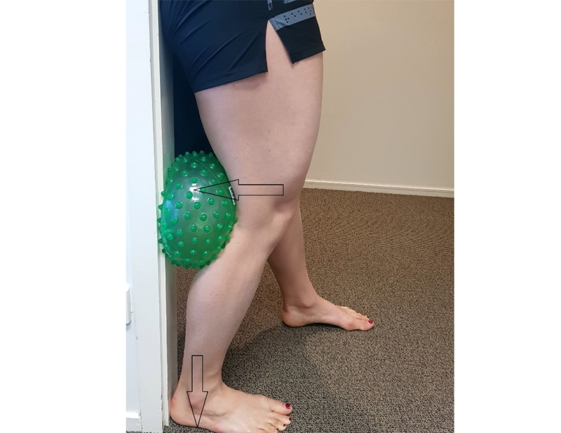 Place the ball just above the knee crease so the bulk of the ball is against the hamstring muscle and calf muscles.
