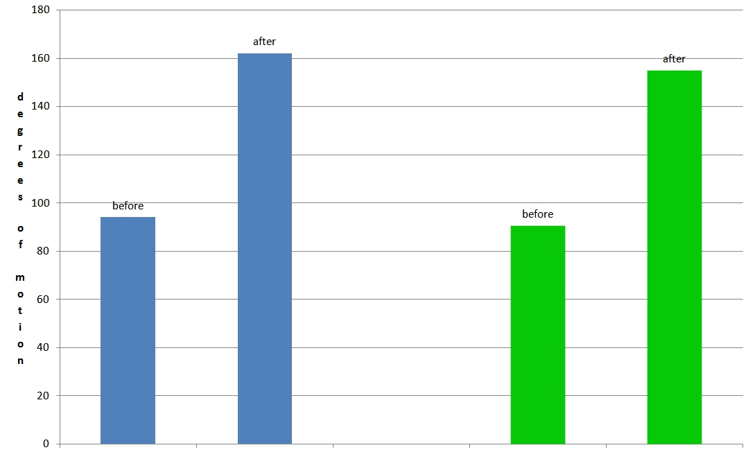 Blue bars show before and after goniometer scores for shoulder flexion, while green bars show before/after scores for abduction.