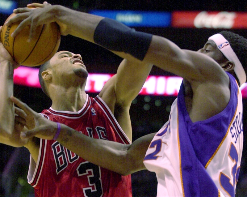 Chicago Bulls forward Tyson Chandler (L) is fouled by Phoenix Suns forward Amare Stoudemire as Chandler attempts to take a shot, 2004.