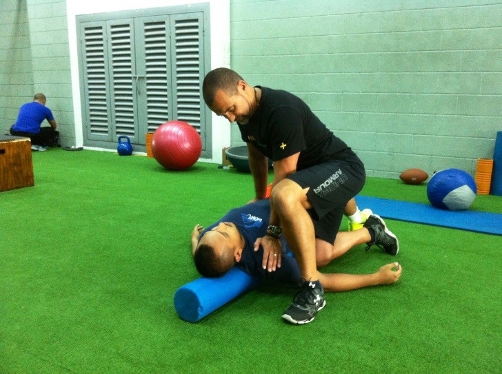 a. Have the subject lie length-wise on a foam roller. This ensures the scapulae are free to retract and not fixed by the floor.