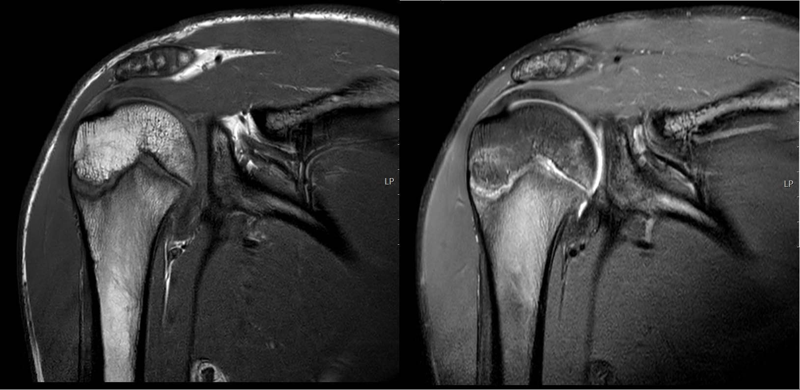 Coronal T1-weighted (left) and PD SPAIR (right) images demonstrate widening of the proximal humeral physis with associated fluid signal and surrounding bone marrow edema.