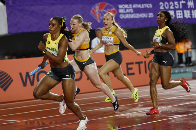 Jamaica’s Shelly-Ann Fraser-Pryce and Tia Clayton, Germany’s Nele Jaworski and Jessica-Bianca Wessolly in action during the women’s 4x100 metres relay - heat 2 REUTERS/Tingshu Wang