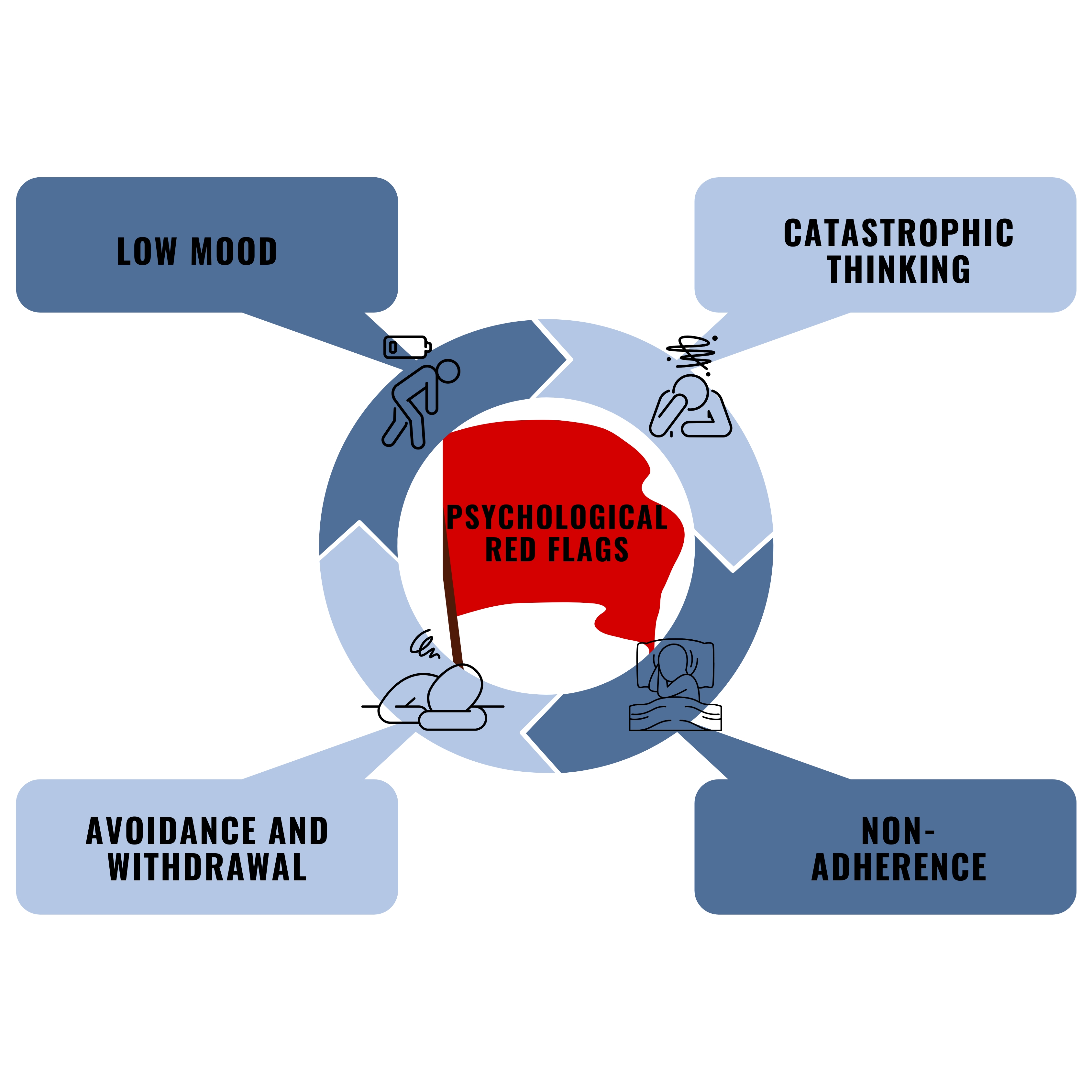 Psychological red flags in injury recovery can significantly impact an athlete’s rehabilitation journey. These include low mood, catastrophic thinking, avoidance and withdrawal, and non-adherence. Each of these can hinder motivation, disrupt engagement, and slow progress.