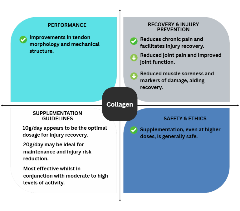 Their findings suggest that 10g/day appears to be the optimal dosage for injury recovery, while 20g/day may be ideal for maintenance and a reduction in the risk of injury. The participants also demonstrated improved mental health scores over six to nine months with these dosages. The use of CP supplementation is most effective whilst in conjunction with moderate to high levels of activity (> 188 mins a week), suggesting that the increased blood flow and collagen production turnover during exercise, encourages the delivery of the amino acids and peptides to connective tissue, which is generally poorly vascularized.
