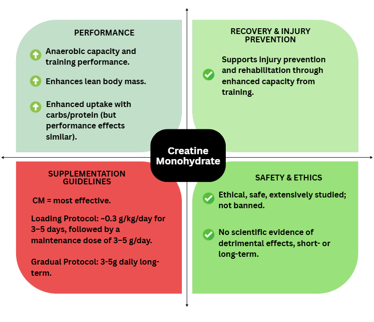 Creatine enhances strength, reduces muscle damage and soreness post-exercise without adverse reactions. It’s safe to use in younger and older populations over short- and long-term periods. Effective dosing includes ~0.3 g/kg/day for 3–5 days, followed by a maintenance dose of 3–5 g/day, or 3-5g/day for long-term use. Athletes experience the greatest benefit when supplementation is done in conjunction with exercise and a balanced diet. However, in certain sports where increasing muscle mass may hinder performance (e.g., endurance athletes, cycling), practitioners and athletes may need to consider dosage and use carefully(5). Furthermore, creatine’s physical and cognitive effects in older populations are significant to warrant consideration for clinicians working with this cohort.