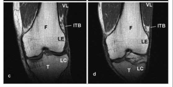 This is why other researchers postulate that this movement is merely an illusion as the ITB repeatedly tightens(6). With flexion, the patella moves along the femoral condyle and the tibia moves posteriorly. This tightens the ligamentous part of the ITB – ie the portion that attaches to Gerdy’s tubercle on the tibia and stretches the posterior fibres of the ITB tautly over the LFE (see figure 2). Evidence via magnetic resonance imaging (MRI) studies show that this tightening produces compression rather than friction in the area (see figure 3). Magnetic resonance imaging shows that compression against the LFE is greatest at 30 degrees of knee flexion(5).