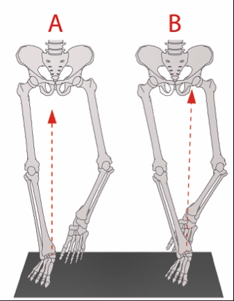 The arrow shows the ground reaction force medial to the knee joint. With hip adduction and a narrower base of support, the ground reaction force moves even more medially, placing a varus torque at the knee, stressing the lateral side.