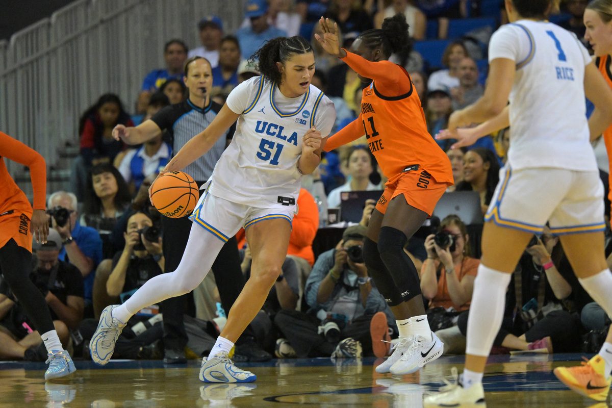 Oklahoma State Cowboys forward Achol Akot defends UCLA Bruins center Lauren Betts in the second half at Pauley Pavilion. Mandatory Credit: Jayne Kamin-Oncea-Imagn Images
