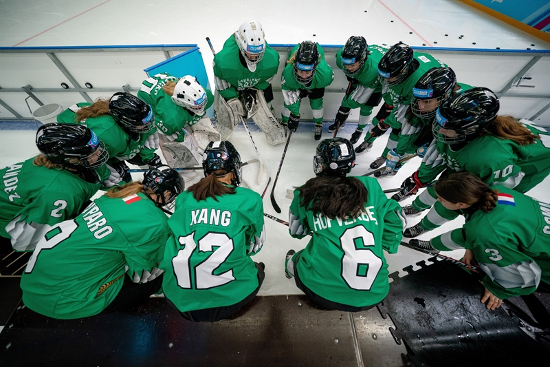 2020 Winter Youth Olympics - The Green team in a huddle at the end of the Ice Hockey 3-on-3 Women’s Mixed / Joe Toth for OIS/IOC/