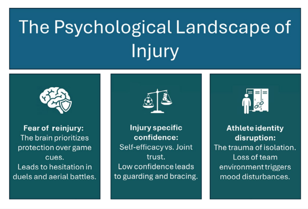 In a match, a player’s brain is bombarded with stimuli. If the brain is also busy processing fear and consciously controlling the knee joint, the bandwidth is exceeded. The player becomes neurocognitively overloaded, which explains the mechanism of many non-contact reinjuries. The brain is distracted by fear and fails to send the correct pre-activation signal to the hamstrings during a landing, leaving the ACL vulnerable. Therefore, psychological readiness is essential for maintaining the feed-forward motor control required for high-speed football(15).