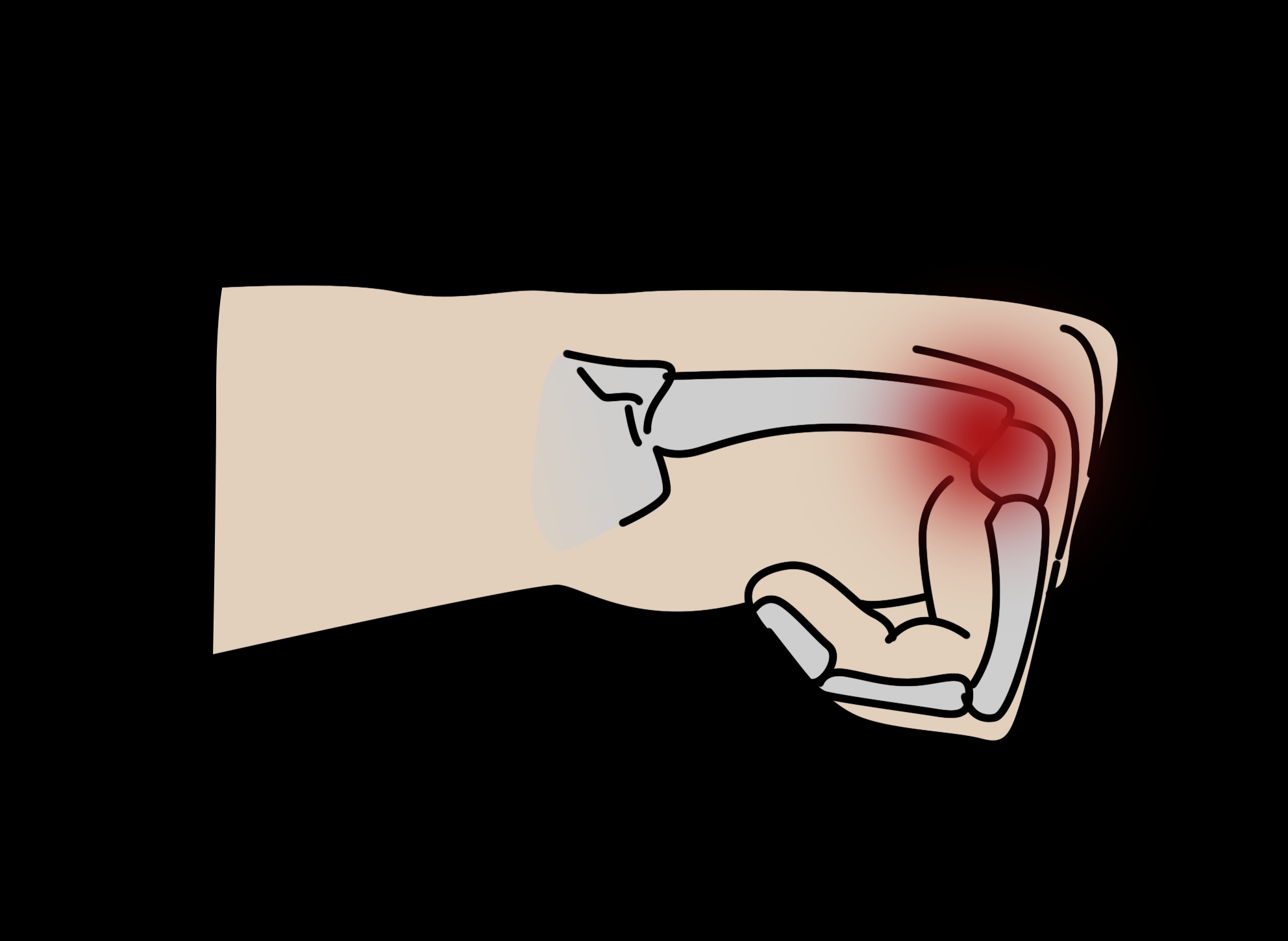A Boxer’s Fracture is a fracture of the neck of the fifth metacarpal. The mechanism of injury is an acute axial load to the fifth metacarpal that creates a bending moment at the neck (see figure 4). A fifth metacarpal fracture may occur when punching and result in a dorsal angulation due to the pull of the interosseus muscles of the hand(9).