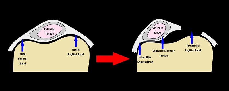 Boxer’s Knuckle is an injury to the extensor mechanism of the second to fifth MCPJs, with damage to the longitudinal central tendon, transverse sagittal fibers, and underlying joint capsule (see figure 3). Boxer’s Knuckle may result from an acute traumatic incident or repetitive trauma(8).