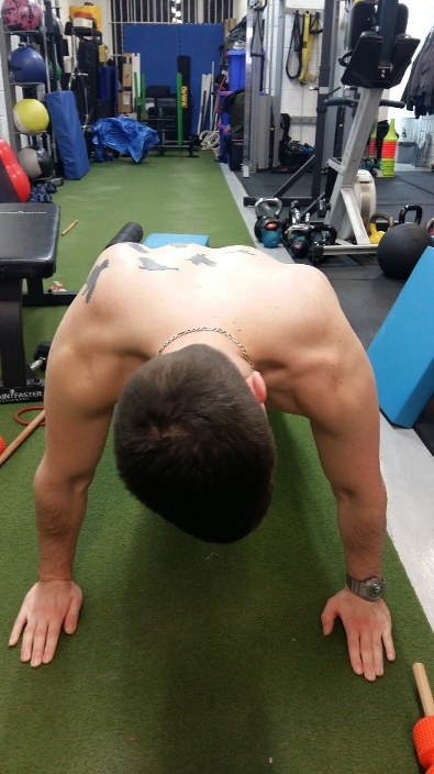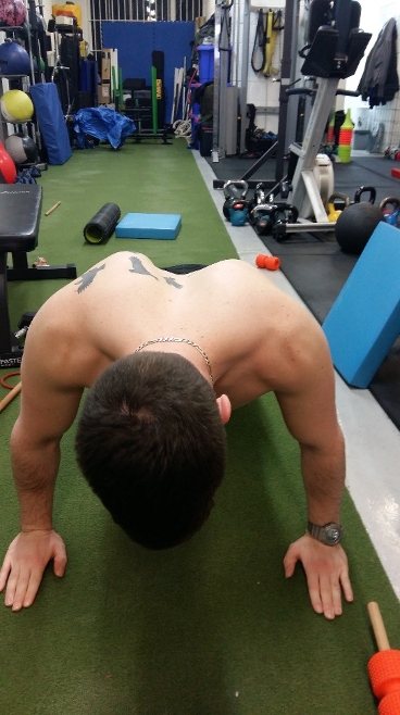 This scapular winging is best appreciated when watching the scapular position during a push-up exercise. Often, if the winging is due to a muscle imbalance and the primary scapula stabilizer is the pectoralis minor, it usually corrects if the patient is asked to ‘plus’ and protract the scapula. To cue the athlete to perform this plus maneuver, once they are in the plank position, ask them to push the floor away. This is also referred to as a scapular pushup. If the wing disappears then the cause is most likely muscle imbalance, if it remains then it may be a pathological inhibition of the SA due to an injury to the cervical nerve root or long thoracic nerves (see figures 3-6).