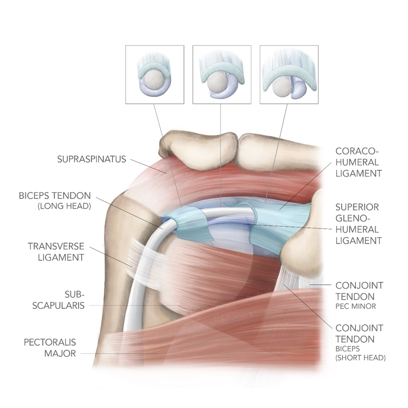 The unique anatomy of the LHBT (with its pulley system) is responsible for the stability of the tendon as it courses from the intra-articular space into the bicipital groove. The pulley is formed by four structures (see anatomy above)(30):