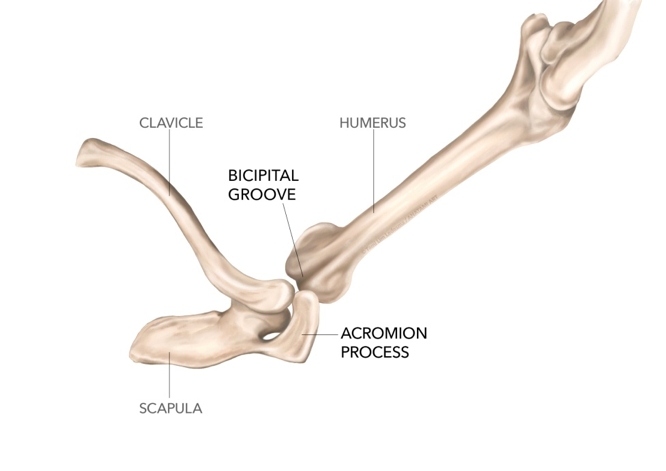 Other injuries that cause inflammation, and subsequent long-term degeneration include impingement of the LHBT. This may be due to the close approximation of the bicipital groove (and hence LHBT) and the anterior aspect of the acromian process when the arm is fully elevated overhead (see figure 2). This would be a potential provocative movement in overhead athletes who repeatedly use their arms above the head such as swimmers, cross fit athletes and tennis players.