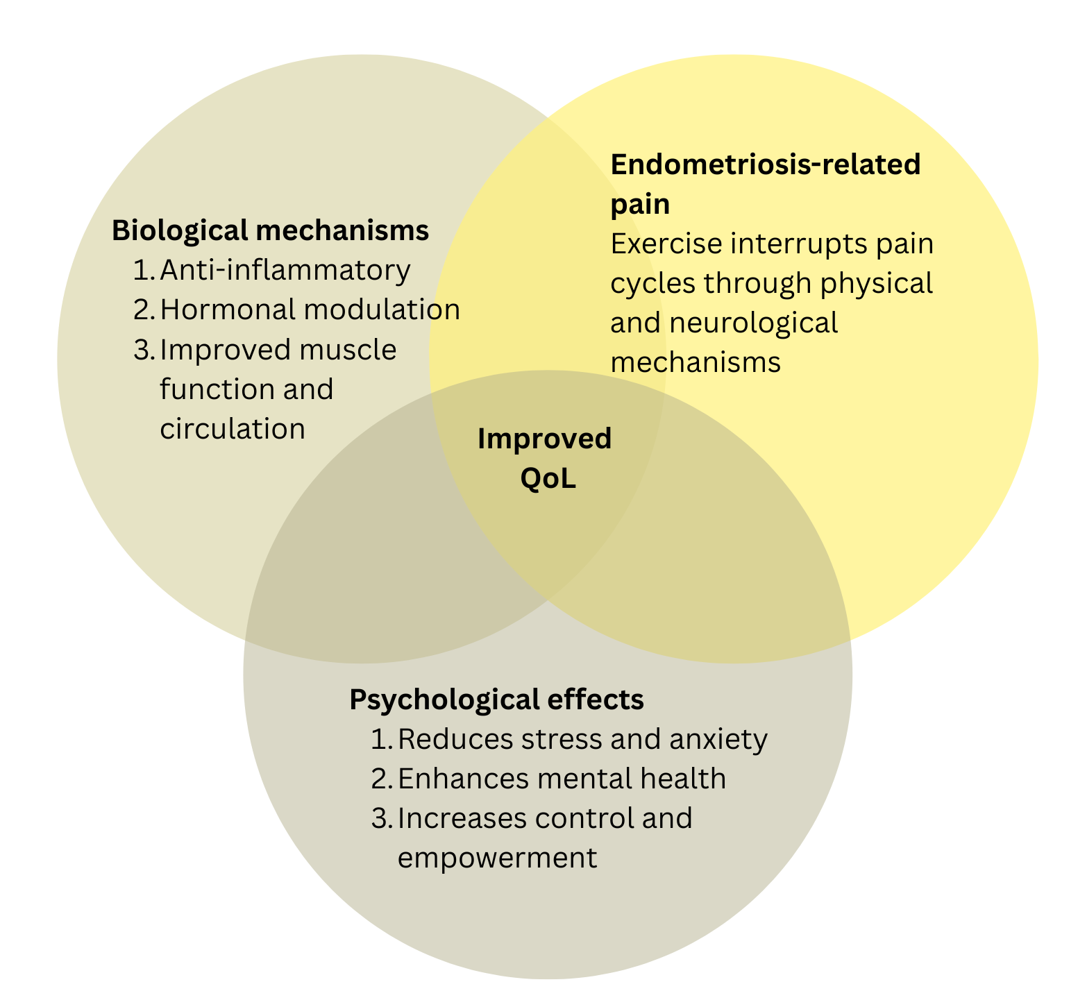 Women with endometriosis commonly experience mental health problems such as depression, stress, anxiety, and emotional exhaustion(4-6). Exercise meaningfully improves psychological well-being by reducing stress and anxiety, enhancing mental health, and increasing a sense of control and empowerment(2,5). Relaxation-based movement practices, including yoga and stretching, are particularly effective. Interestingly, these changes are amplified in group settings due to additional support and a sense of less isolation. Supervised and guided exercise programs aid the restoration of confidence and foster a sense of empowerment, both of which are vital for long-term self-management(3).