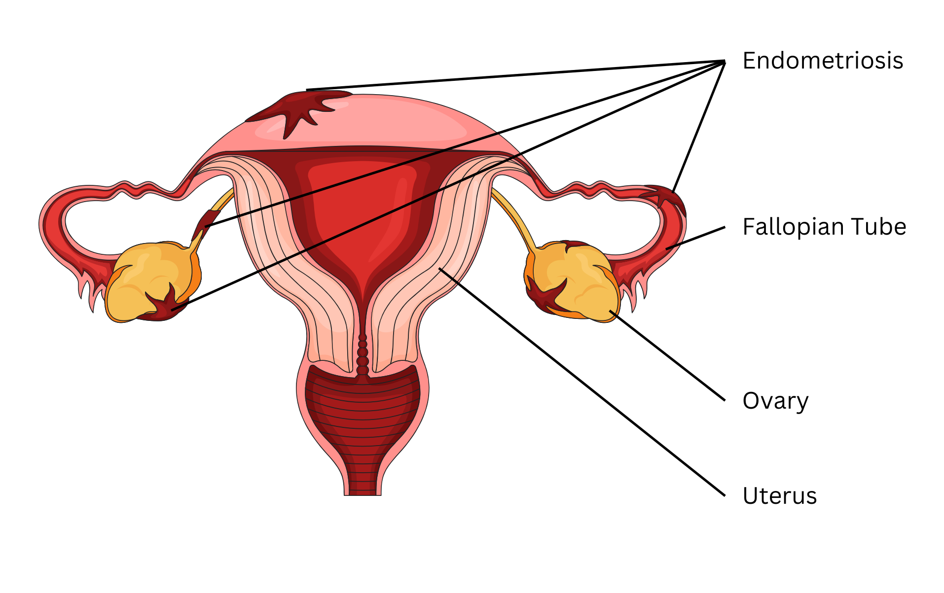 Endometriosis develops when tissue resembling the uterine lining implants in locations such as the ovaries, bladder, bowel, or peritoneum (see figure 1). These implants respond to hormonal cycles by growing and bleeding, which then triggers the chronic inflammation that can lead to scar tissue, adhesions, and ongoing pelvic pain over time(1,4). Women can be asymptomatic or experience migraines, fatigue, infertility, dysmenorrhea, dyspareunia, and bowel or bladder discomfort(4). Oxidative stress may play a big role in the progression of the disease(1). The elevated levels of reactive oxygen species in the peritoneal fluid contribute to sustained inflammation and the sensitization of the pelvic nerves(1).