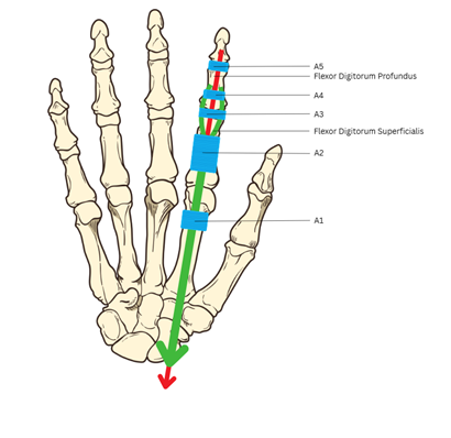 While there are five annular pulleys in each digit except the thumb (which has two), the second and the fourth are the most common sites of injury (see figure 1). In a flexor pulley injury, "bowstringing" can occur, in which the affected digit cannot flex to its full range of motion and is associated with local edema and pain. Clinicians grade them on a scale of one to four.