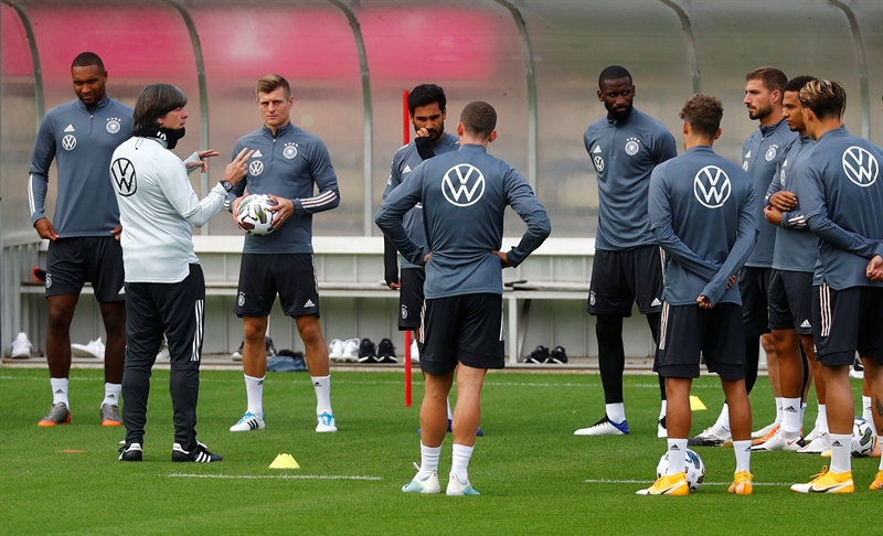 September 1, 2020 Germany coach Joachim Loew speaks to players during training REUTERS/Kai Pfaffenbach