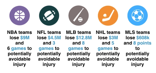 In professional sport, the amounts spent on wages lost when players are unavailable for selection justify employing a whole army of injury prevention experts! As an example, an average team in the English Premier League pays an estimated £9 million in wages to players who are unavailable for selection due to injury over the course of one season(12). In addition, the resulting loss of league points contributes another £36 million in lost potential income(12). Similar results are evident across other professional sports leagues (see figure 3). While injuries in amateur sport do not result in wasted salary payments, personal cost can be high. An organization sponsoring multiple teams (schools, universities, clubs) could provide tangible benefits to their members if they employed a sports injury prevention professional.