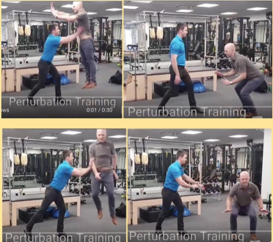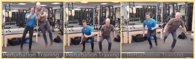 Australian physiotherapist and ACL guru Mick Hughes promotes high level proprioceptive training, which simulates performance situations. When ready to return to sport-specific training, continue with partner push drills to increase readiness for performance. The athlete jumps and is pushed from any direction. The key to the drill is landing with good form, first on both feet and then on just one. (Photos used with permission(5)).