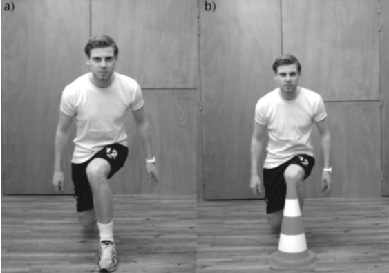 In a narrative review, researchers in the Netherlands found that when instructed to keep the knee over the toes in a split squat (photo a), the athlete relies on external verbal cues to perform the activity. He focuses on following the instructions for the knee and loses control at the hip. When instructed to perform the targeted task of moving his knee toward the cone (photo b), the athlete feels and controls body movement, as noted in the decrease in hip adduction(6). (Photos used with permission.)