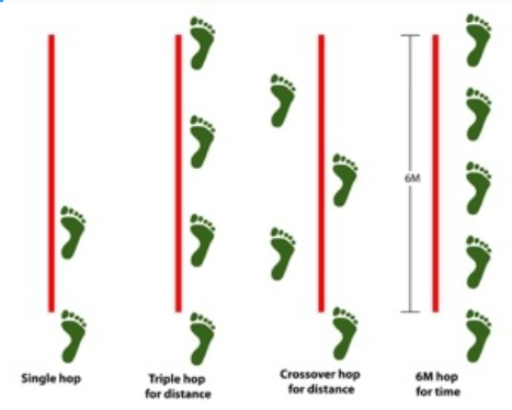 Time the athlete as he/she hops for six meters (right hand graphic). Take the average of two-timed trials. Record the difference as a measure of impairment and potential for conservative management. Record subsequent times to indicate response to therapy.