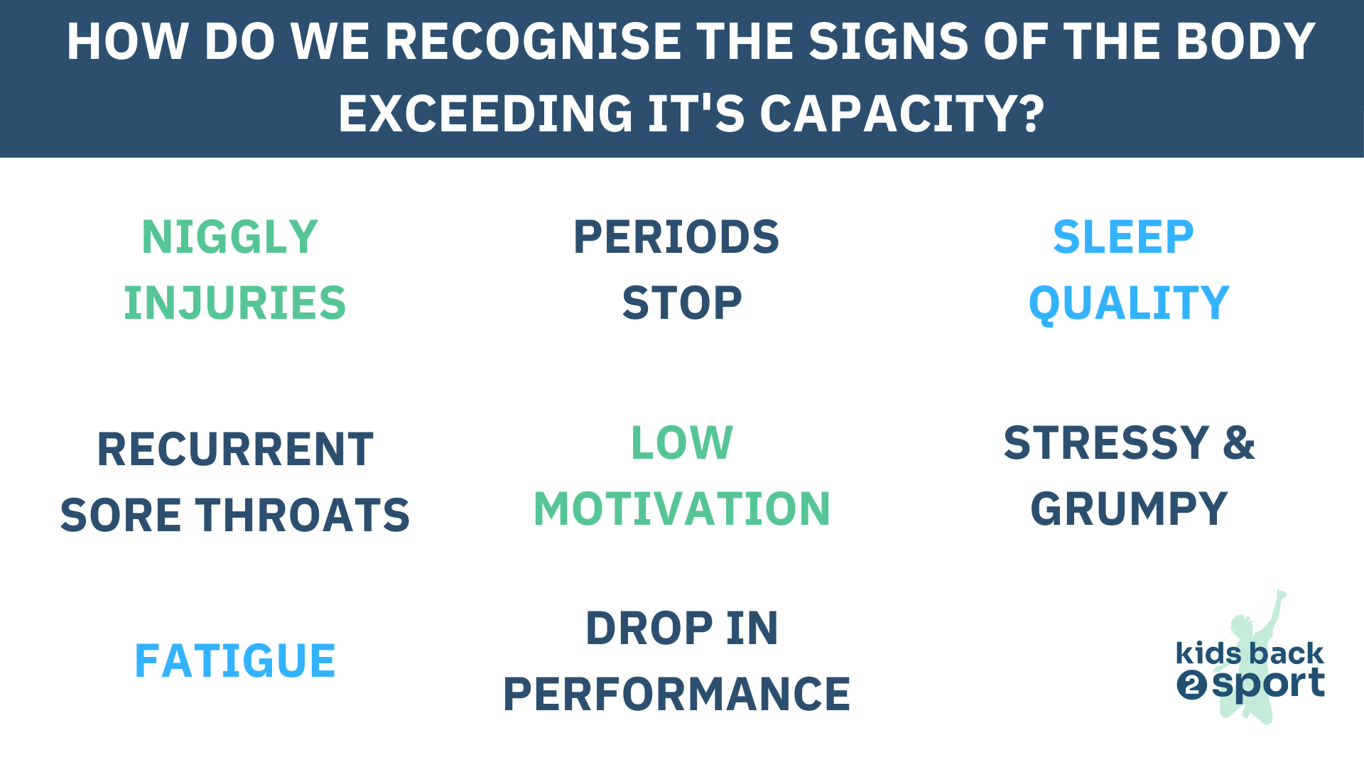 Athletes need to maintain a positive energy balance where energy intake exceeds energy expenditure. Low energy availability (LEA) can trigger a downregulation of non-essential hormonal processes, affecting multiple bodily systems, including bone synthesis, and heightens susceptibility to LBSI(13). A lack of awareness about the energy requirements of youth athletes increases the likelihood that they will fail to reach their full potential. Clinicians must focus on education regarding the signs and symptoms that indicate when an athlete is exceeding their current capacity (see figure 2).