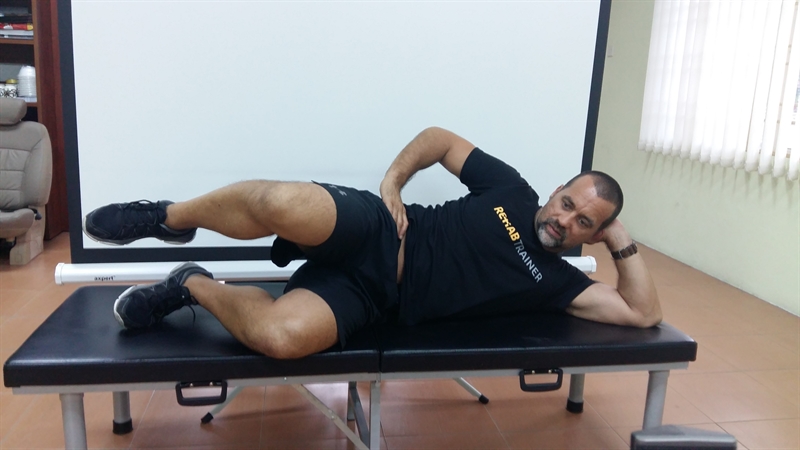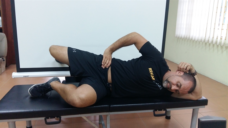 Start position – The client is positioned in side-lying, with the unaffected side down. The pelvis and spine are in neutral alignment, with the bottom leg flexed for support. The uppermost leg is extended and needs to be above the horizontal. The hip is laterally rotated and extended, as far as no lumbar extension occurs.